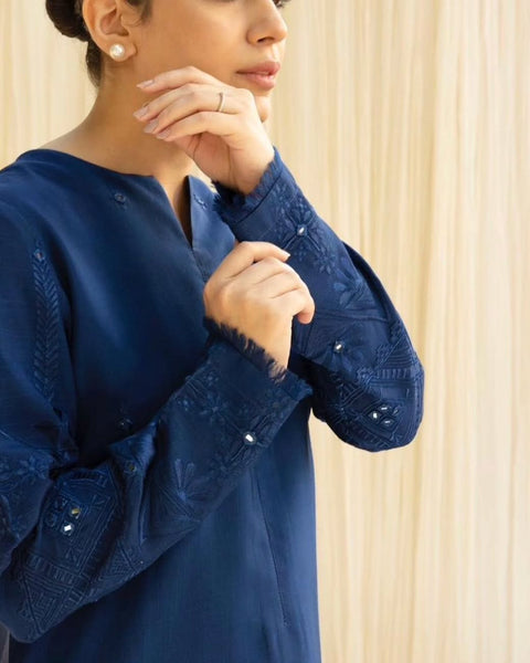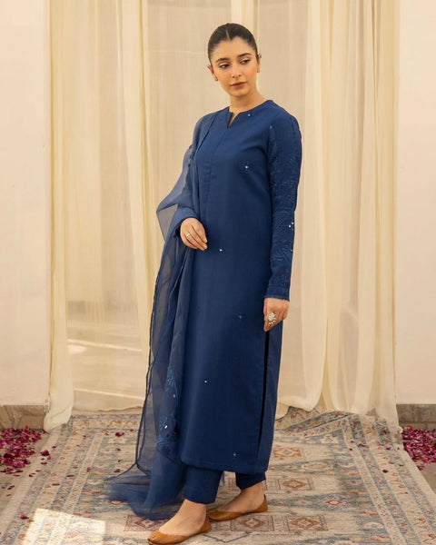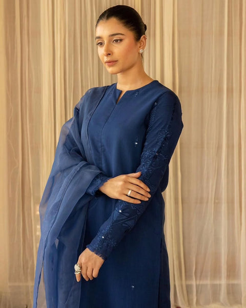 Accompanying the dress is a beautifully embroidered organza dupatta. The delicate organza fabric, adorned with detailed embroidery, provides a luxurious and graceful complement to the outfit, making it ideal for both casual and formal occasions.