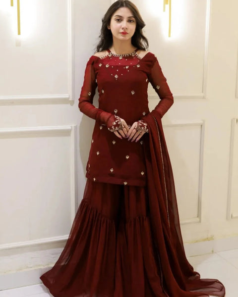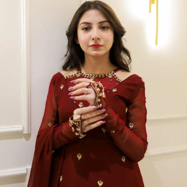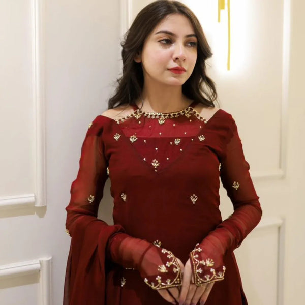 This ensemble typically includes a stylish long shirt, matching trousers, and a chiffon dupatta that adds a soft and refined touch. Ideal for weddings, formal gatherings, and festive occasions, a chiffon suit with handmade work reflects timeless beauty, sophistication, and attention to detail ✨