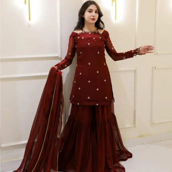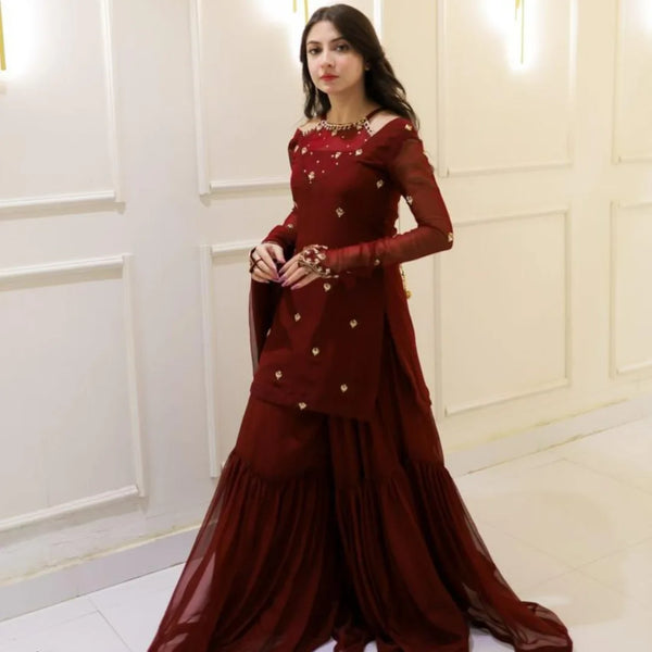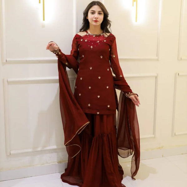 3 pec chiffon Dress with handmade work is a perfect blend of elegance and craftsmanship. Made from lightweight and flowy chiffon fabric, this outfit offers a graceful and luxurious look. The suit is beautifully enhanced with delicate handmade embroidery, featuring intricate thread work, beads, sequins, or stones, carefully crafted by skilled artisans.