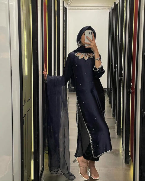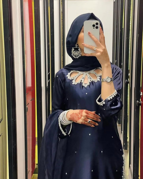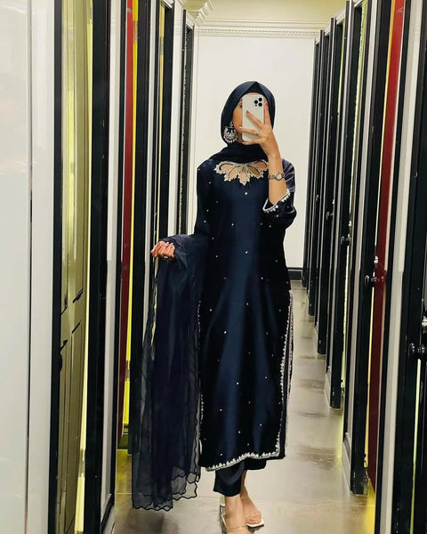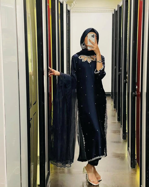 - **Shamooz Silk Kameez:** The main piece of the outfit is a luxurious shamooz silk kameez. Known for its rich texture and subtle sheen, shamooz silk exudes sophistication and grace. The fabric drapes beautifully, making it ideal for creating elegant and flattering silhouettes. Whether you choose a classic or contemporary design, this kameez is sure to make a statement