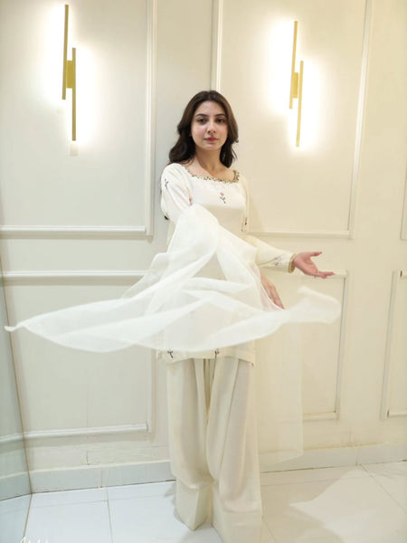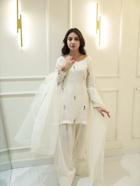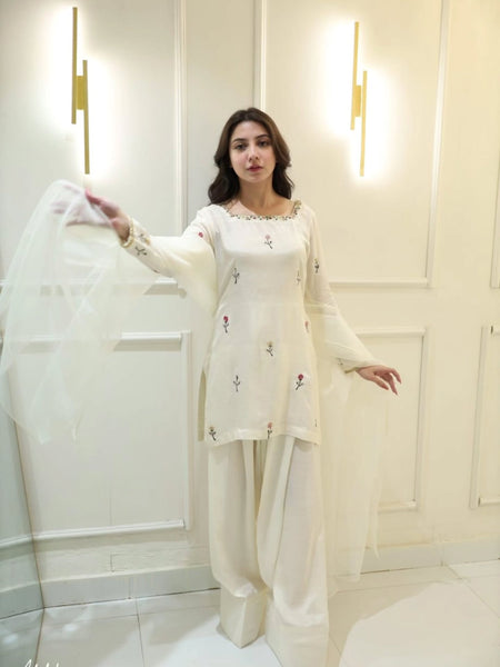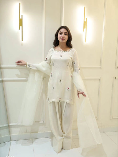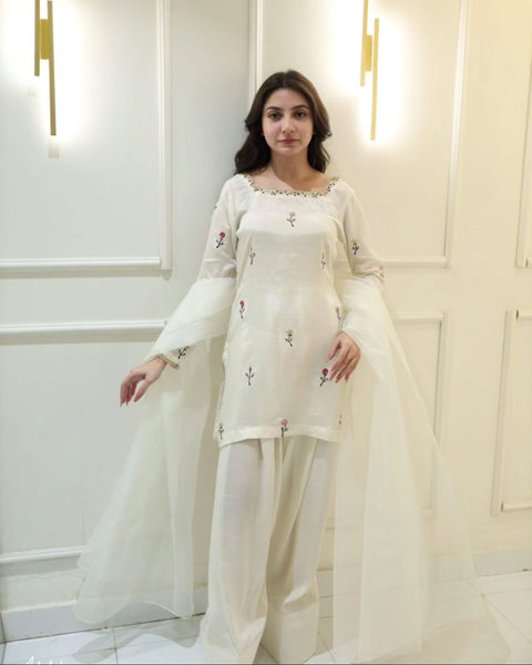 This 3-piece premium dress is crafted from high-quality raw silk fabric, known for its rich texture and luxurious feel. The fabric gives a graceful structure and a refined, elegant appearance, making it perfect for formal and festive occasions.