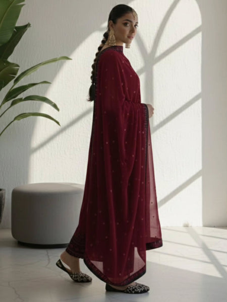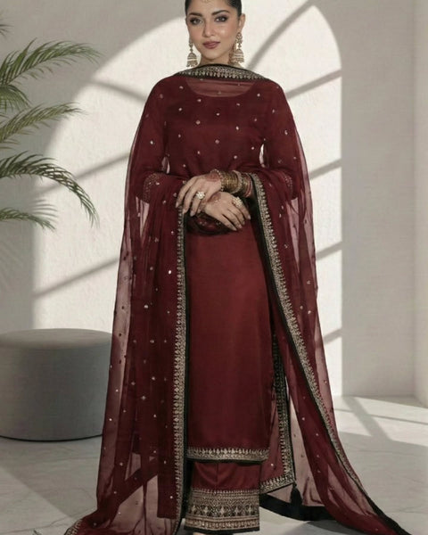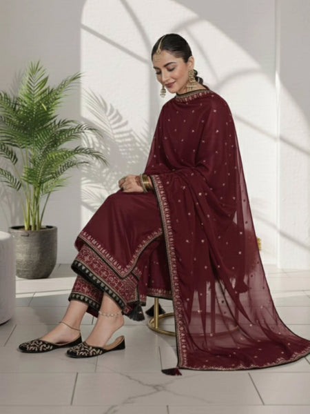 This 3-piece premium dress is crafted from high-quality raw silk fabric, known for its rich texture and luxurious feel. The fabric gives a graceful structure and a refined, elegant appearance, making it perfect for formal and festive occasions.